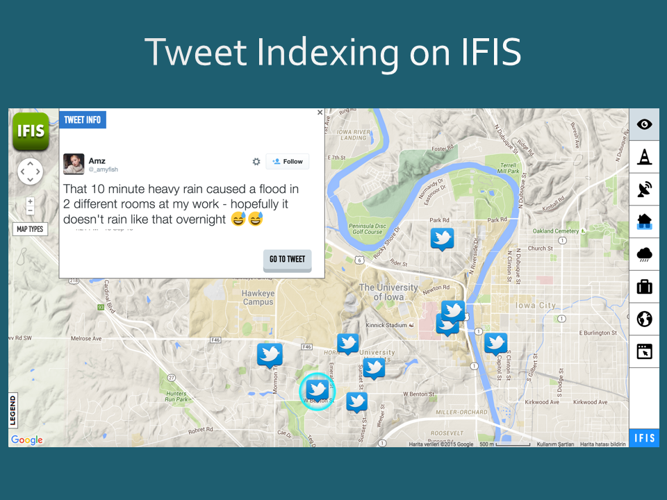 - Sit, M.A., Koylu, C. & Demir, I., 2019. Identifying disaster-related tweets and their semantic, spatial and temporal context using deep learning, natural language processing and spatial analysis: a case study of Hurricane Irma. International Journal of Digital Earth, 12(11), pp.1205–1229. (DOI: https://doi.org/10.1080/17538947.2018.1563219)
