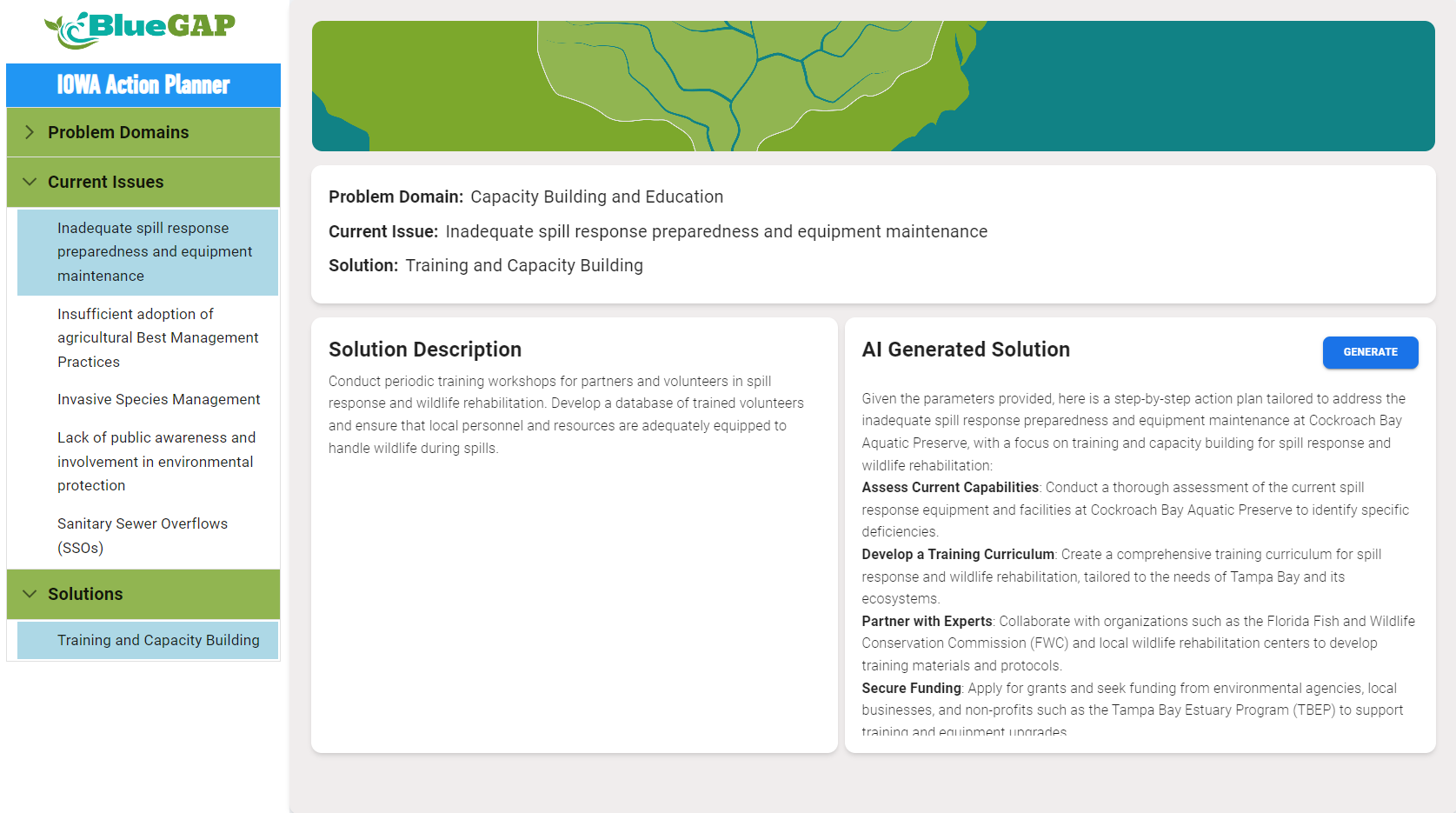 The Blue-Green Action Platform Information System (BlueGAP IS) is a cutting-edge cyber infrastructure platform designed to assist with comprehensive water quality data analysis and provide detailed demographic statistics. The platform leverages artificial intelligence technologies in key regions, including Iowa, Tampa, and the U.S. Virgin Islands. BlueGAP IS is a collaborative effort, developed through partnerships between institutions like the University of South Florida, the University of Iowa, and organizations such as Black In Marine Science and the Tampa Bay Estuary Program.