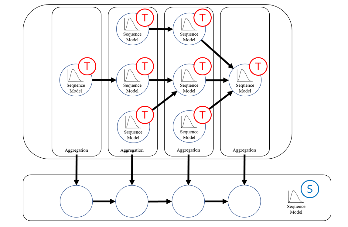 GNRRM model structure on the example watershed. The calculation starts from the temporal sequence model for the rainfall-runoff simulation on each land. After appropriate aggregation, the spatial sequence model is used for the spatial level modeling.