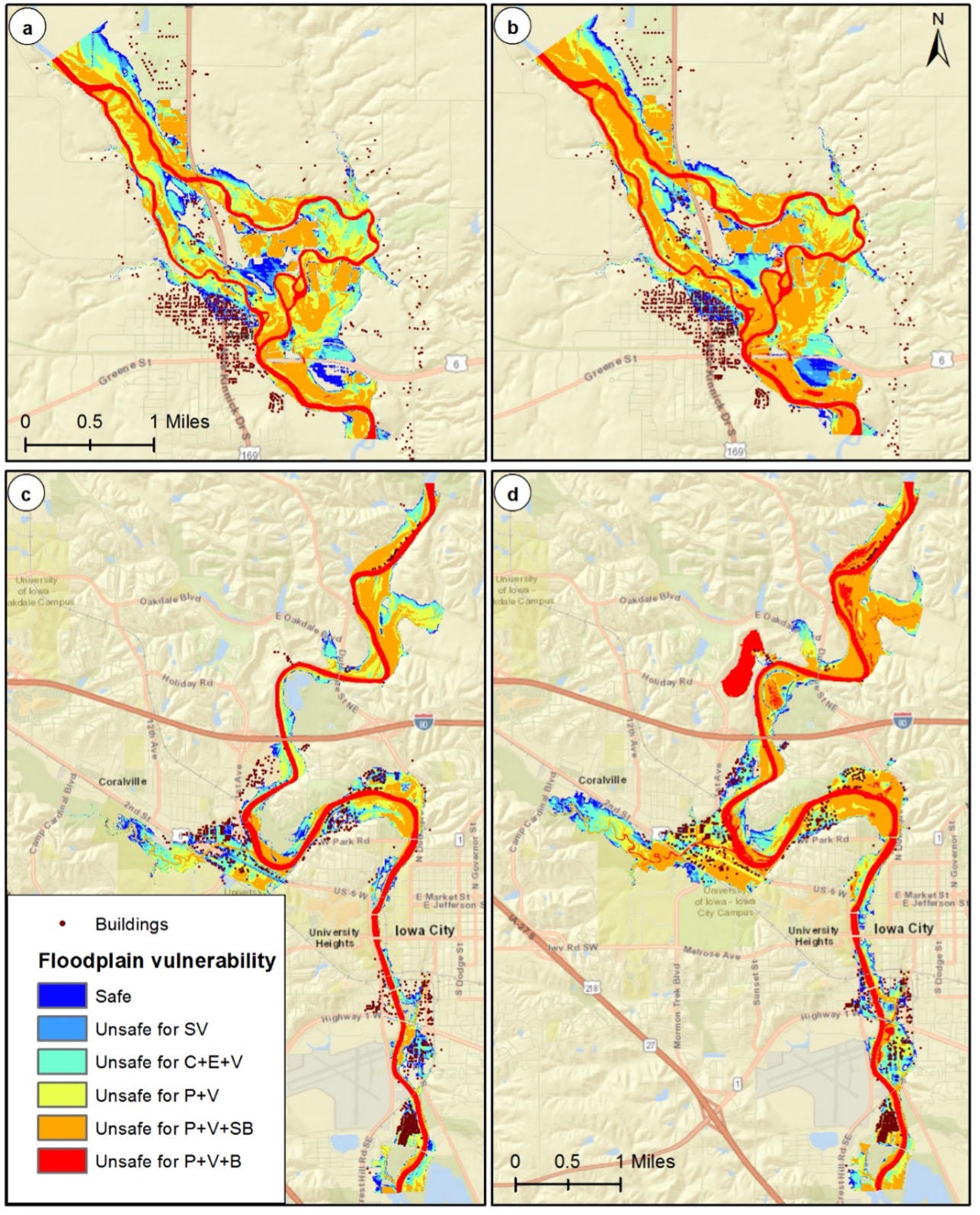Floodplain vulnerability classification during the 100-yr flood (left) and 500-yr flood (right) for Adel (a, b) and Iowa City (c, d); SV: small vehicles, C: children, E: elderly, V: all vehicles, P: all people, SB: structural buildings or buildings without special requirements, B: all buildings).