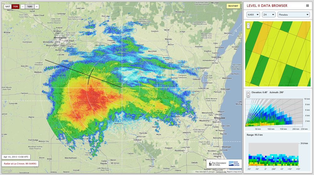 An interactive radar raw data browser is developed for visualizing and browsing real-time and historical HYDRO NEXRAD data. The interface allows users to visualize the full volume scan from radar, and vertical and horizontal sectors from the 3D volume scan. Mapping interface allows users to navigate in the spatial domain and zoom to areas of interest.