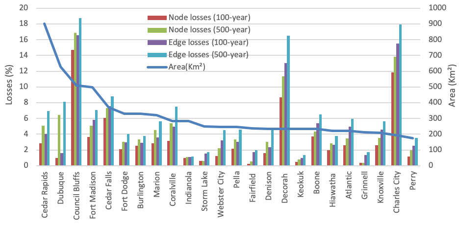 Node and edge losses for each city under 100-yr and 500-yr return periods sorted by the area of each city