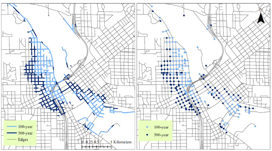The affected road edges segments (left) and nodes (right) under two flood scenarios in the city center of Cedar Rapids