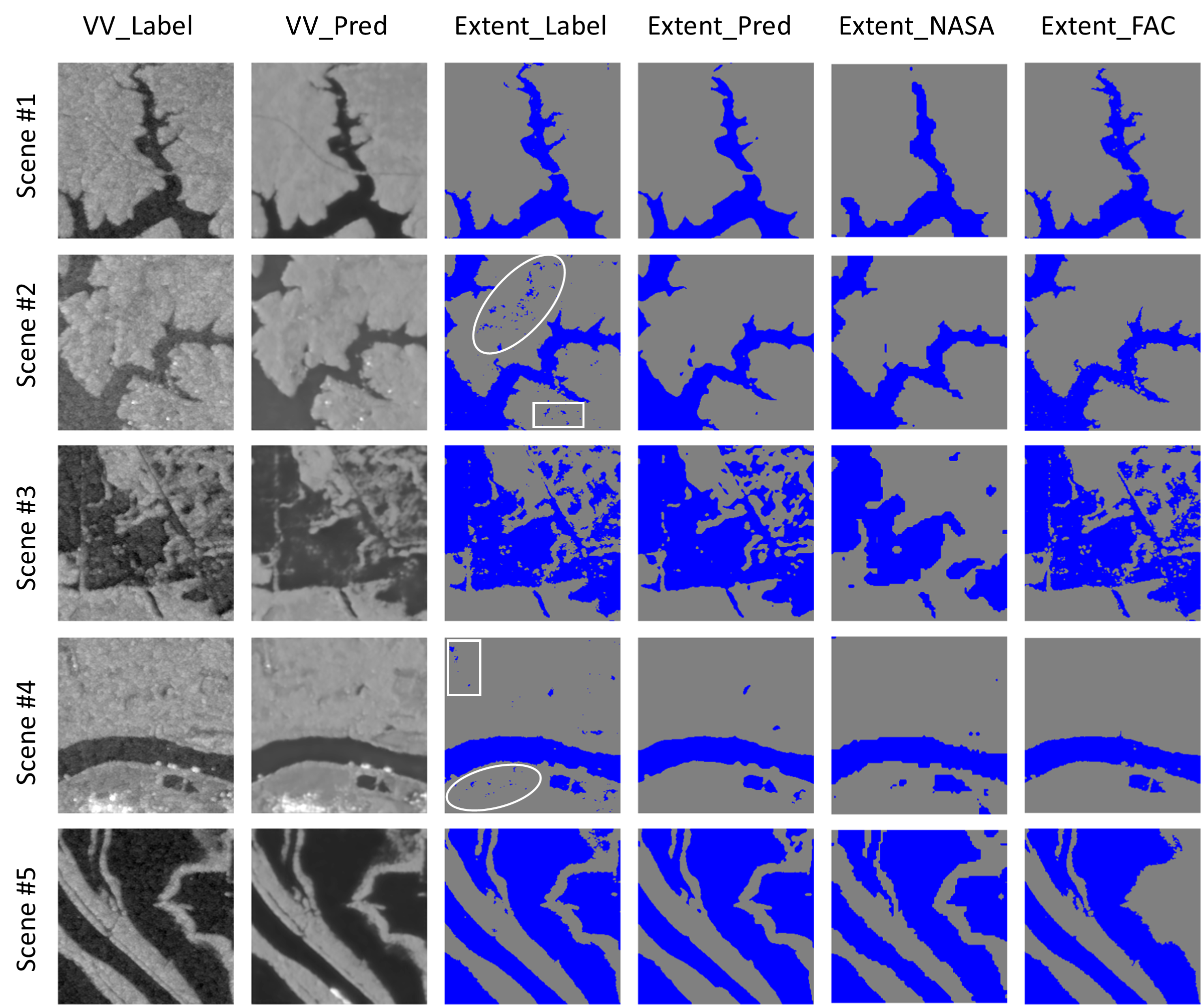 MA-SARNet is a one-shot SAR image forecasting framework built with a modified MA-Net (Figure 1), to predict pixel-level backscatter values of SAR images in response to meteorological and geomorphic driving forces. The model performance was evaluated against the benchmark performance created with the temporal persistence assumption and was compared against the label image, label water extent, and two independently validated flood maps. Compared to the benchmark performance, model predictions show an increase of 31.9% and 17.8% for the mean and median AAI (Assemble Accuracy Index) and an increase of 37.9% and 15.1% for the mean and median NSE (Nash-Sutcliffe Efficiency) on the test set. Results showed that the flood extent derived from backscatter predictions is more robust against misclassifications caused by pixel-level noise compared to the flood map derived using the real backscatters and those from two additional flood map repositories (Figure 2). Results from spatial and temporal robustness tests demonstrate that the model has sufficient generalization potential for real-time, physically informed, deep learning-based earth surface prediction tasks to facilitate fast response to and mitigation for future floods.