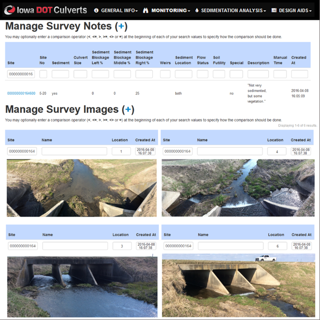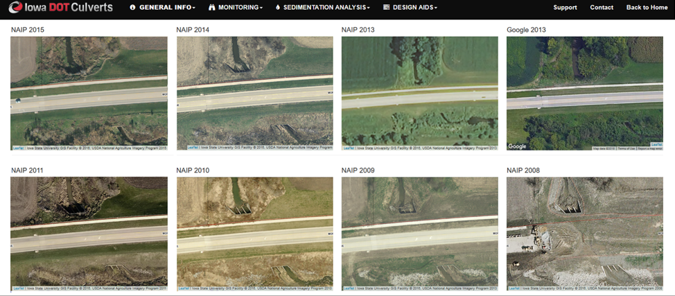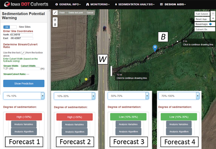 The “Iowa DOT Culverts” platform aims at informing on the potential for inception and development of sedimentation at culverts. The platform offers a web-based problem-solving environment for a) managing inventory and retrieving culvert structural information; b) integrating diverse culvert-related datasets (e.g., culvert inventory, hydrological and land use data, and observations on the degree of sedimentation in the vicinity of culverts) in a digital repository; c) supporting culvert field inspections and real-time data collection through mobile devices; and d) hosting the data-driven framework for exploring culvert sedimentation drivers and forecasting culvert sedimentation potential across Iowa. Insights provided through the data-driven framework can be applied to support decisions for culvert management and sedimentation mitigation, as well as to provide suggestions on parameter selections for the design of these structures.