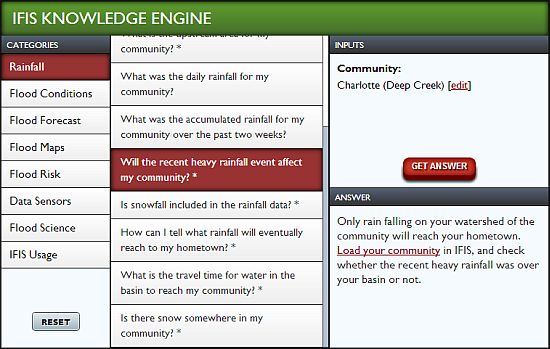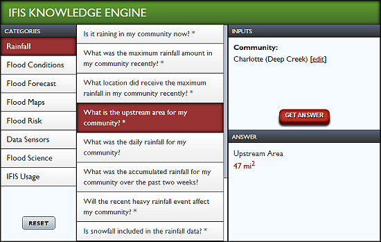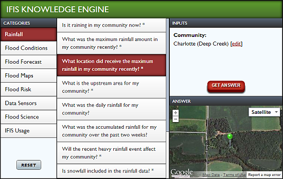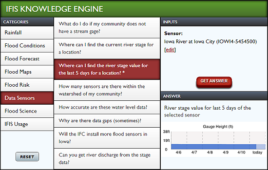 IFIS Knowledge Engine is a computational engine to provide answers to questions grouped into several categories using comprehensive set of tools and data resources available in IFIS. IFIS Knowledge Engine connects to distributed sources of real-time stream gauges, and in-house data sources, analysis and visualization tools. The Iowa Flood Information System (IFIS) is a web-based platform with advanced data integration components, analysis and modeling tools, map layers, and rich geo-spatial visualization interfaces.