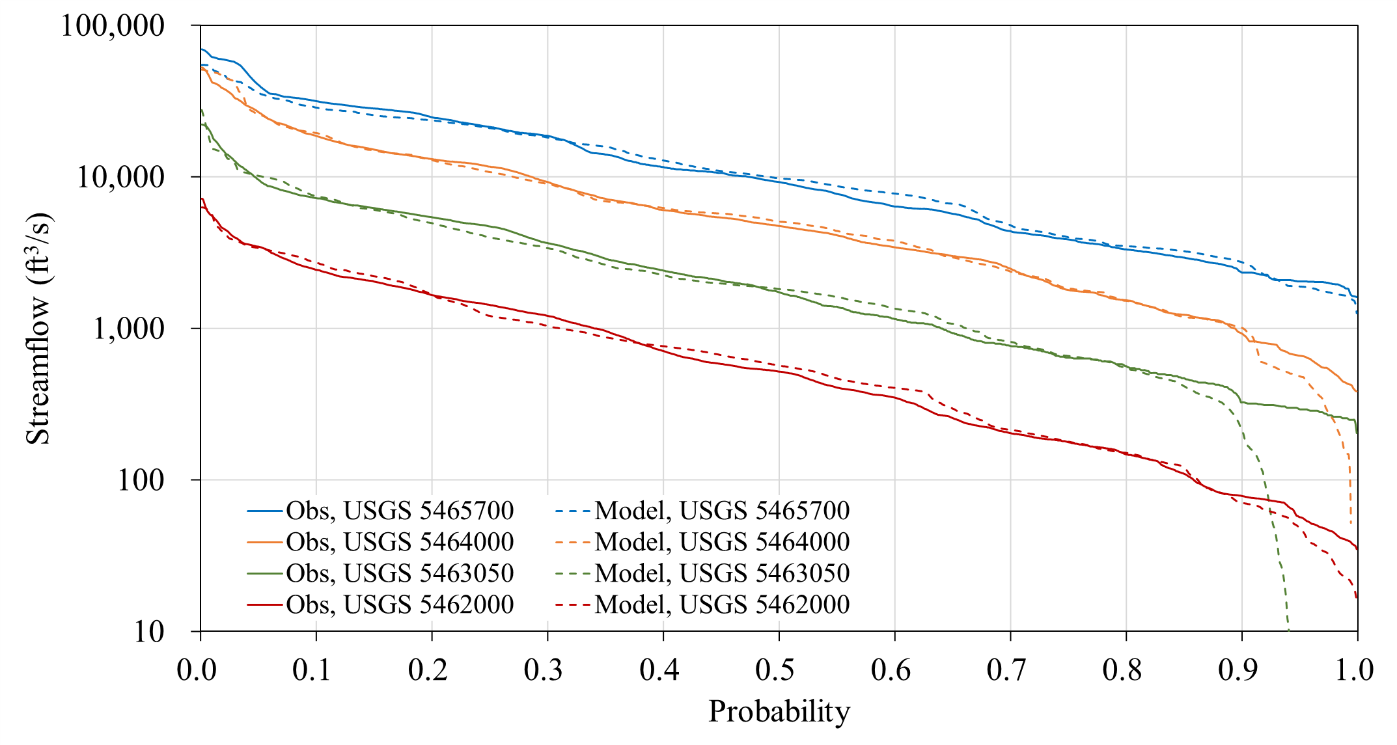 Flow duration curve of the observation and model 120-hr ahead forecast results in four selected gauges in the watershed with the longest upstream linkages.