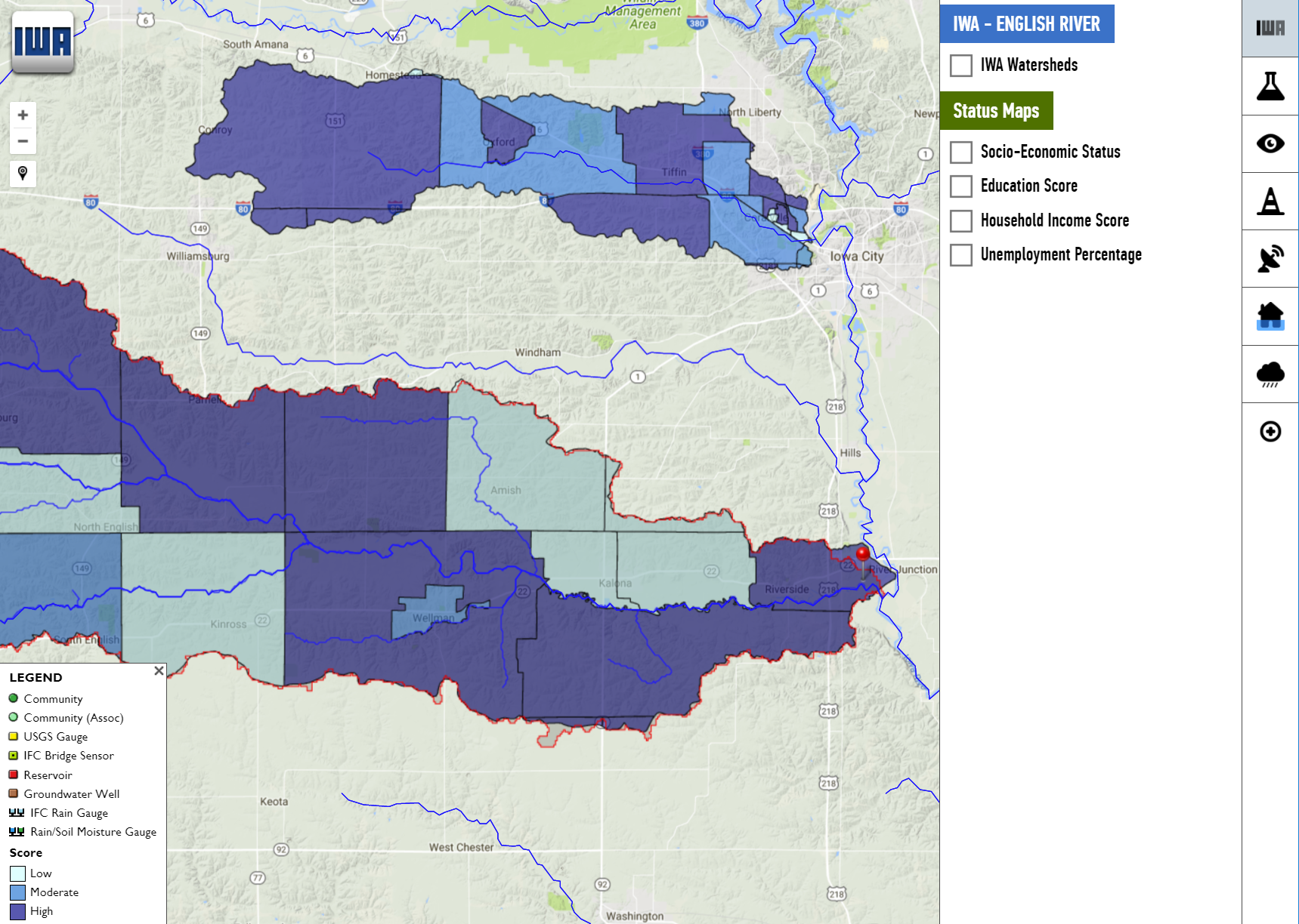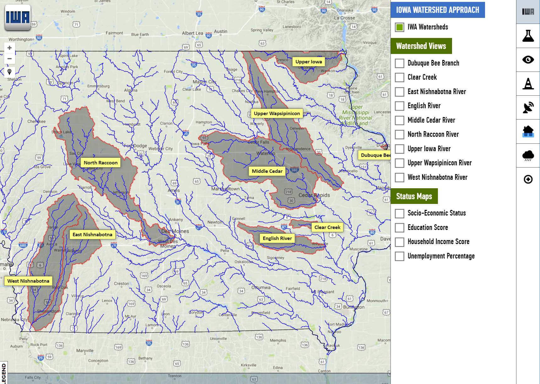 The Iowa Watershed Approach (IWA) is a vision for Iowa’s future that voluntarily engages stakeholders throughout the watershed to achieve common goals, while moving toward a more resilient state. IWAIS provides a comprehensive view of the watersheds in Iowa with real-time information of water quality, flooding, and resilience.