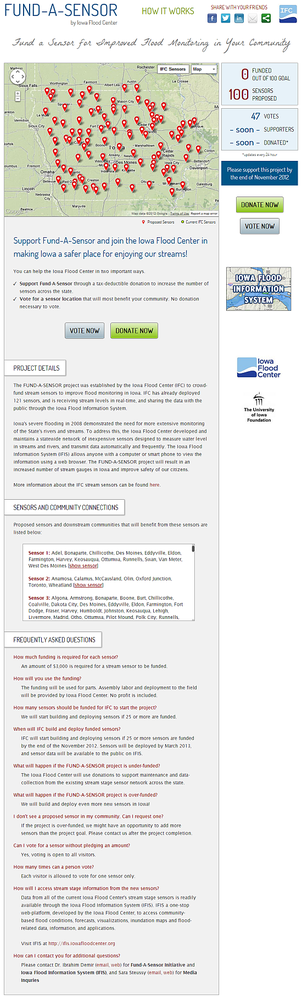 The FUND-A-SENSOR project was established by the Iowa Flood Center (IFC) to crowd-fund stream sensors to improve flood monitoring in Iowa. IFC has already deployed 121 sensors, and is receiving stream levels in real-time, and sharing the data with the public through the Iowa Flood Information System.