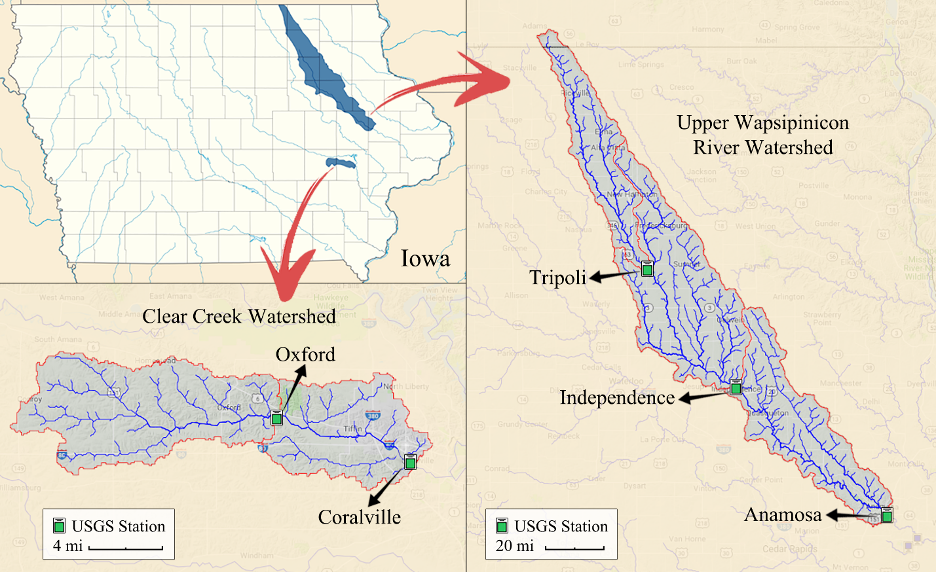 Two watersheds and their locations in the State of Iowa. (bottom left) The detailed streamflow map of the Clear Creek Watershed and (right) the Upper Wapsipinicon River Watershed with sub-watershed boundary (red line) and USGS stream gauges (green markers).