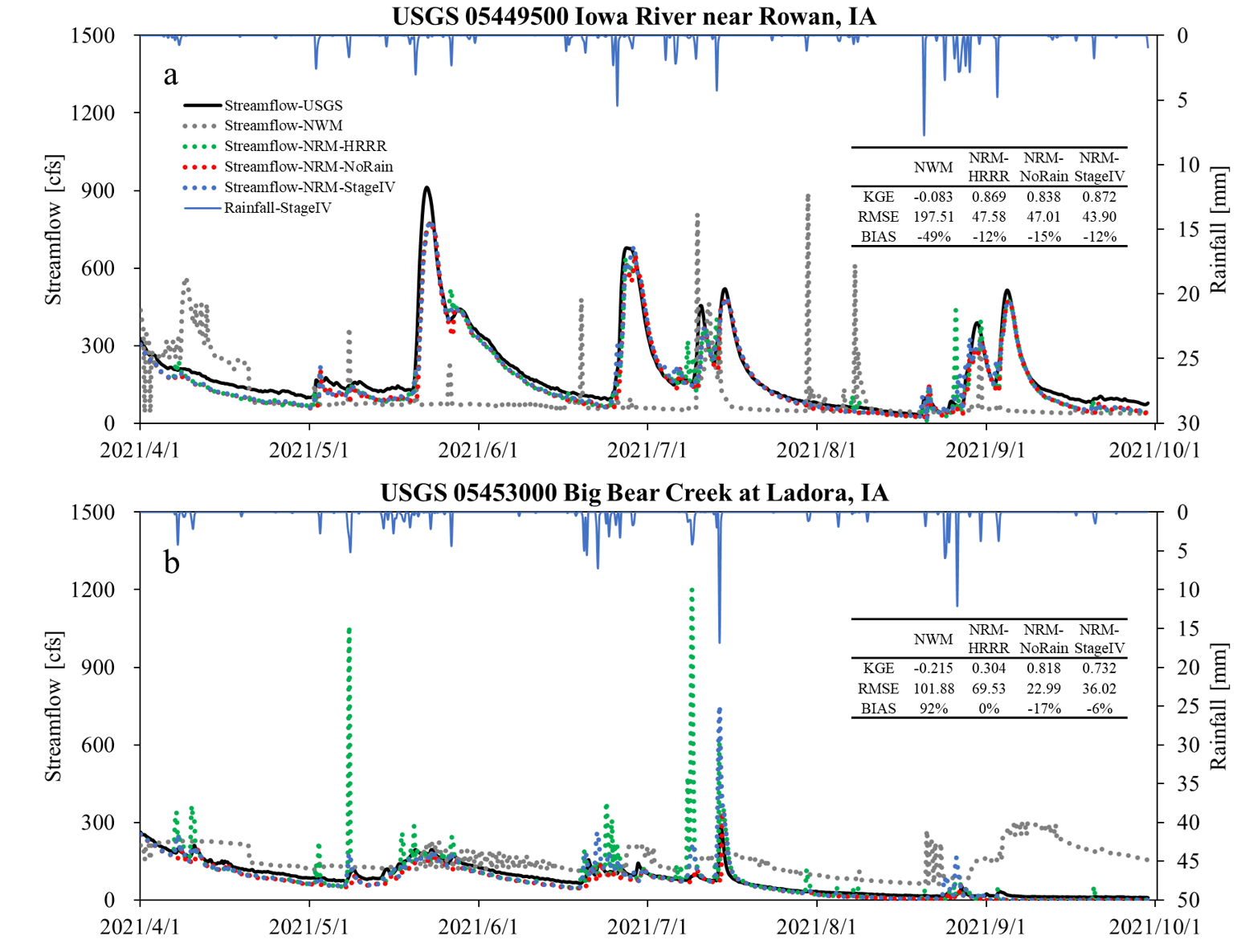 In this project, we proposed a framework for real-time operational streamflow forecasting using deep learning algorithms as shown in Figure 1. We also implemented the framework with the deep learning models in April 2021 in the state of Iowa. In this study, we evaluated the framework using forecast results from April to September 2021. Model performance comparison and post-event analysis are also presented as part of the analysis. Sample results with the evaluations are shown in Figure 2.